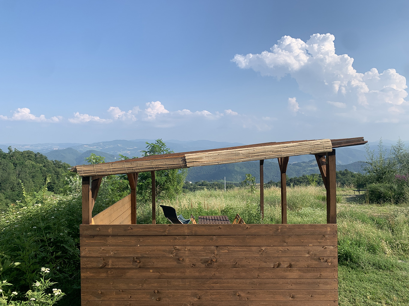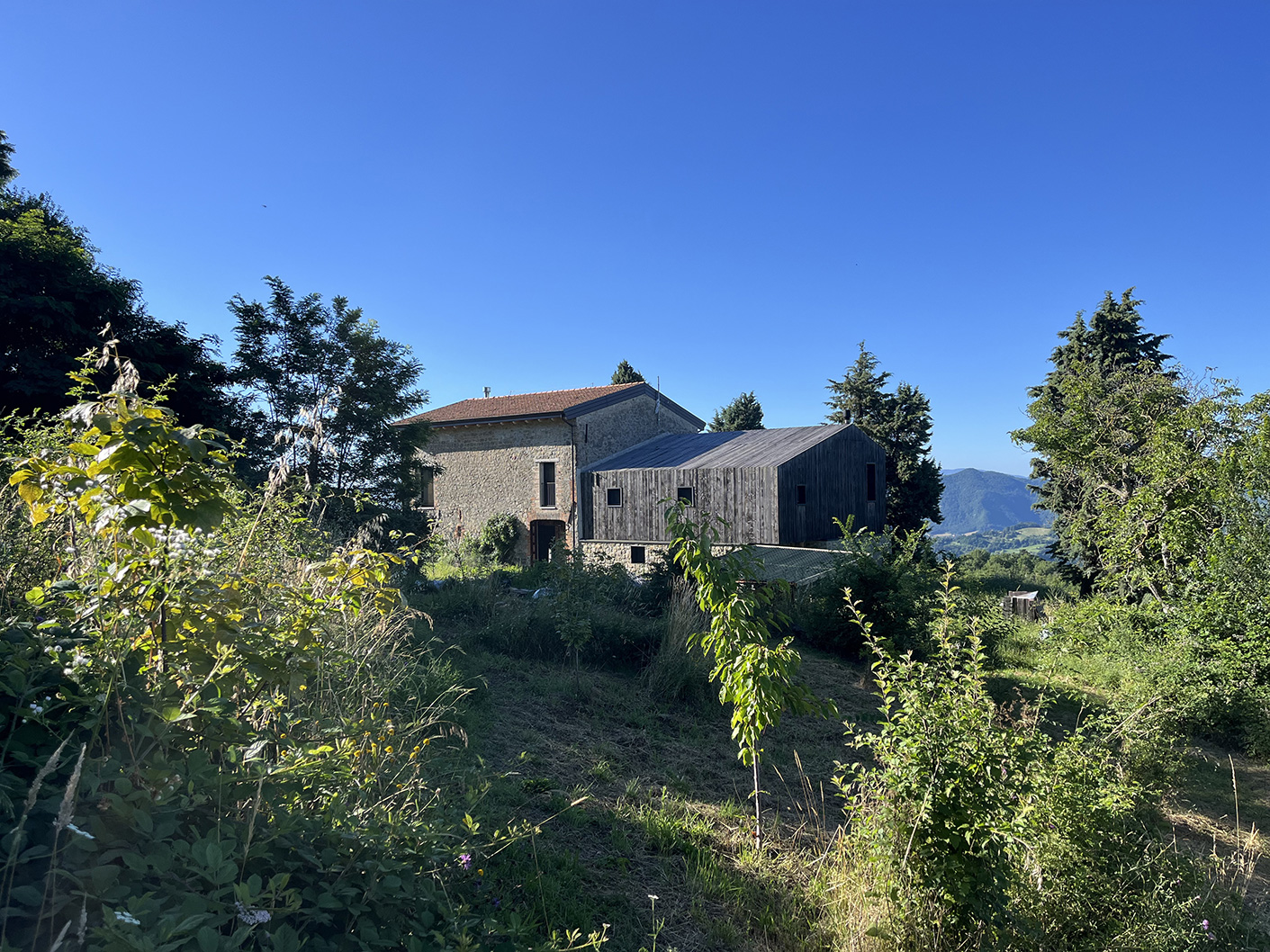 A 25km da Bologna un vecchio fienile ristrutturato in legno ospita un appartamento di design che domina un paesaggio mozzafiato con una vista panoramica sugli Appennini e I suoi boschi.